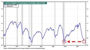 Poměr amerických ukazatelů vedoucích k shodným ekonomickým ukazatelům klesl na 0,85, což je nejnižší úroveň od roku 2008.